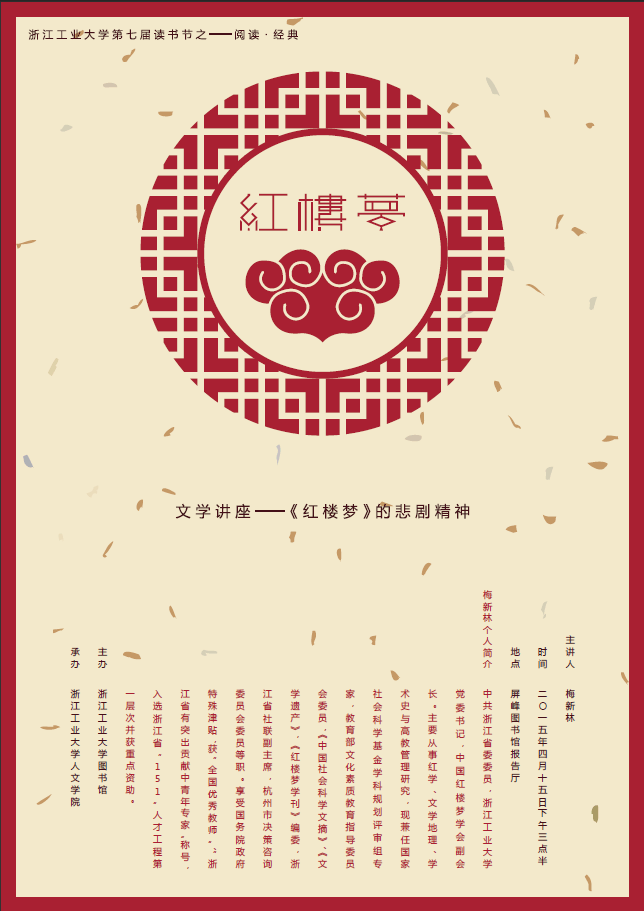 主讲人简介:梅新林,男,浙江省温岭市人,1958年10月生,文学博士,教授,博士生导师。现任浙江工业大学党委书记,兼任教育部文化素质教育指导委员会委员,中国红楼梦学会副会长,《中国社会科学文摘》、《文学遗产》、《红楼梦学刊》编委,浙江省社联副主席等职。主要从事红学、文学地理、学术史研究,主持国家社科基金重大招标项目《浙东学派编年史及相关文献整理与研究》等国家、省部级项目10余项,在《中国社会科学》(中英文版)、《文学评论》、《文学遗产》、《新华文摘》等杂志发表论文100余篇,出版《中国学术编年》(与俞樟华共同主编)、《中国文学地理形态与演变》、《红楼梦哲学精神》等学术著作8部。获国家级教学成果奖二等奖1项,教育部高等学校科学研究优秀成果奖(人文社会科学)二等奖、三等奖各1项,浙江省人民政府社科成果奖一等奖1项、二等奖4项,以及国家新闻出版署第二届“三个一百”原创出版工程图书奖。先后被评为“全国优秀教师”、浙江省有突出贡献的中青年科技人员专家、浙江省特级专家,享受国务院政府特殊津贴。