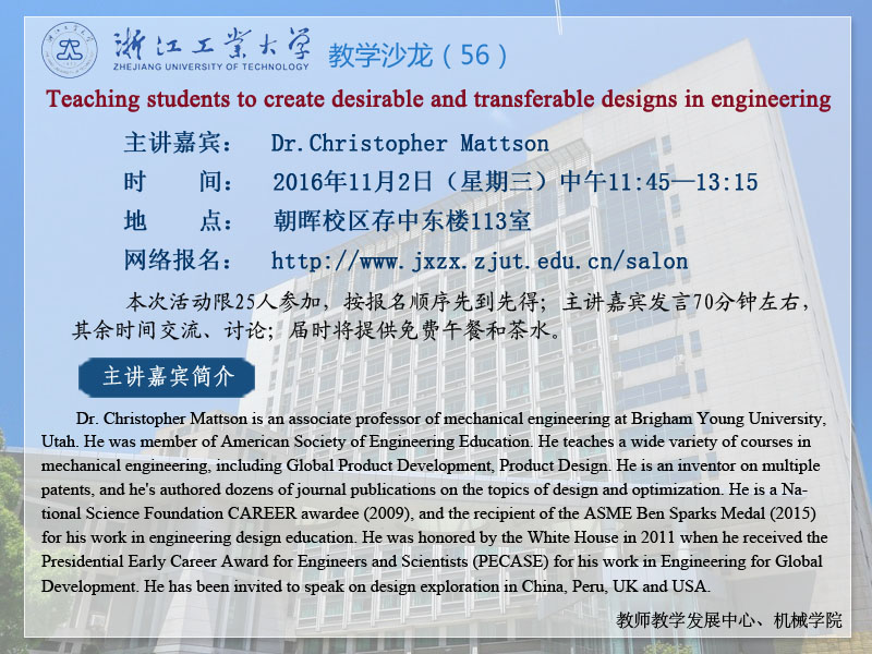 11月2日第56期教学沙龙:Teaching students to create desirable and transferable designs in engineering