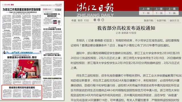 日前,《浙江日报》二版要闻以《我省部分高校发布返校通知》为题,报道我校2022年春节返校工作安排。