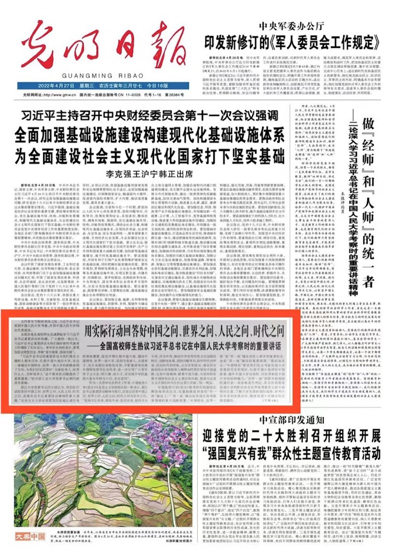 4月27日,《光明日报》头版以《用实际行动回答好中国之问、世界之问、人民之问、时代之问——全国高校师生热议习近平总书记在中国人民大学考察时的重要讲话》为题,刊发我校城乡规划学2020级硕士研究生、浙江省学联执行主席程正俊热议:用实际行动回答好中国之问、世界之问、人民之问、时代之问。