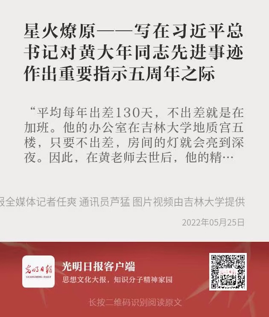 5月25日,光明日报客户端以《星火燎原——写在习近平总书记对黄大年同志先进事迹作出重要指示五周年之际》为题,报道各界知识分子以实际行动践行习近平总书记对黄大年同志先进事迹作出的重要指示精神,“地质宫不灭的灯火”已汇聚成光,成燎原之势。