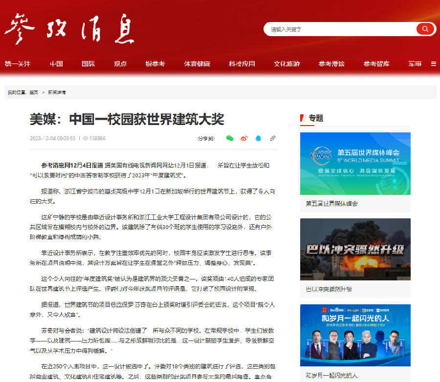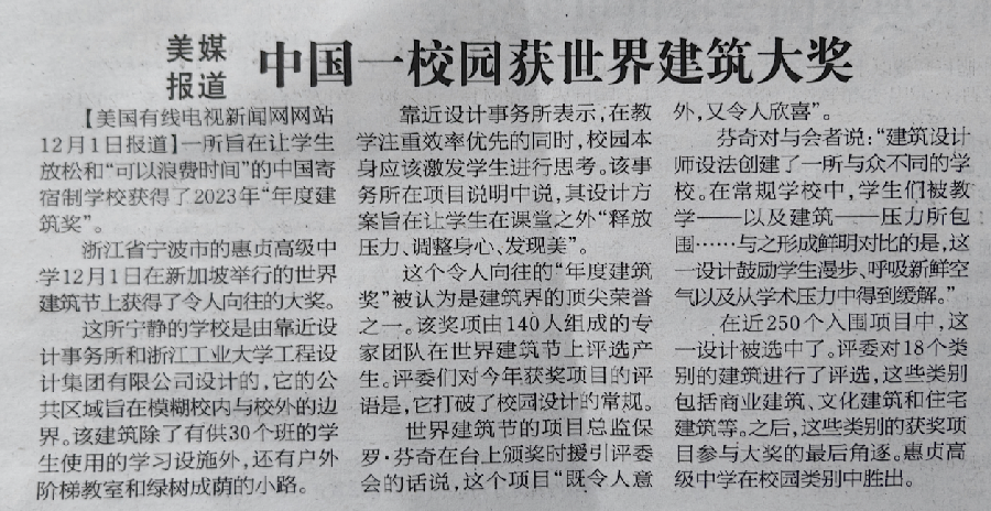 12月4日,《参考消息》以《美媒:中国一校园获世界建筑大奖》为题,报道了我校工程设计集团有限公司|靠近设计事务所主持建筑师马迪设计的作品“宁波惠贞高级中学”,斩获2023年WAF世界建筑节最高奖“年度建筑奖”。