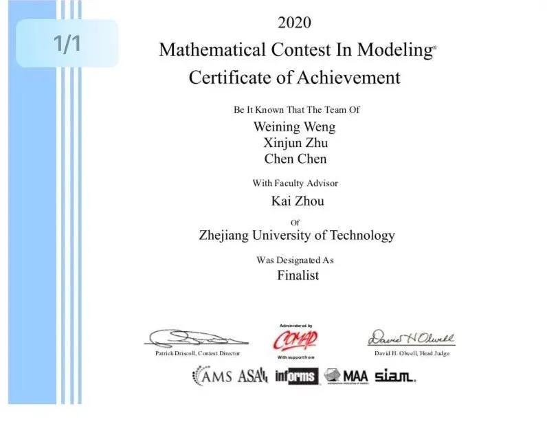 在2020年的美国大学生数学建模竞赛(MCM/ICM)中,健行荣誉生取得了好成绩