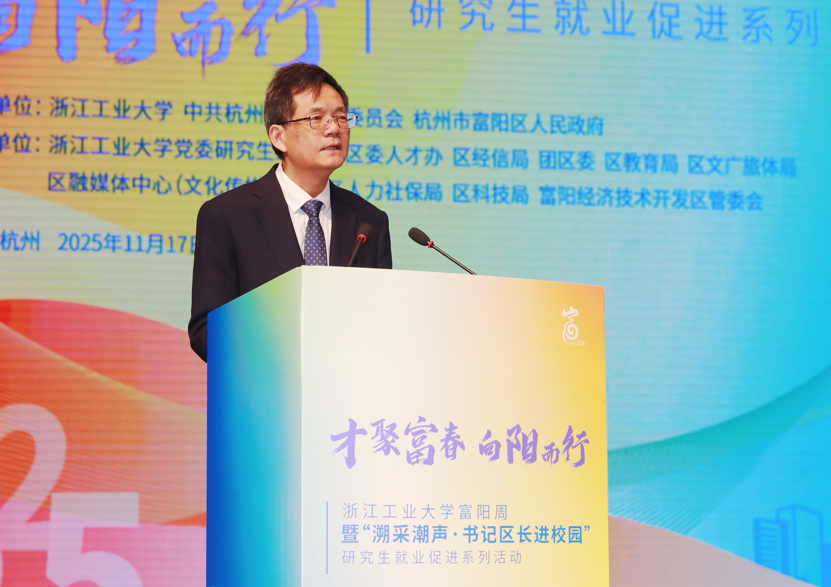 11月17日上午,“才聚富春,向阳而行”浙江工业大学富阳周暨“溯采潮声·书记区长进校园”研究生就业促进系列活动开幕式在屏峰校区举行。校党委书记蔡袁强、富阳区委书记王牮致辞,富阳区委副书记、区长谢渐升作城市推介,杭州市委人才办副主任尹凡,杭州城西科创大走廊党工委委员、管委会副主任李洁,杭州市委教育工委专职副书记、市教育局党组副书记陈萍,杭州市人才管理服务中心(杭州市人事考试院)党委书记主任张锦,杭州市科技局党组成员、二级巡视员宋新剑,浙江工业大学校领导金晓明、胡军、吴巨慧,富阳区领导万重丰、何献忠、蒋晓青、詹艳青、黄泽、凌涛,学校相关职能部门、学院负责人以及师生代表,在富企业家代表、青年代表,富阳区相关部门负责人参加活动。